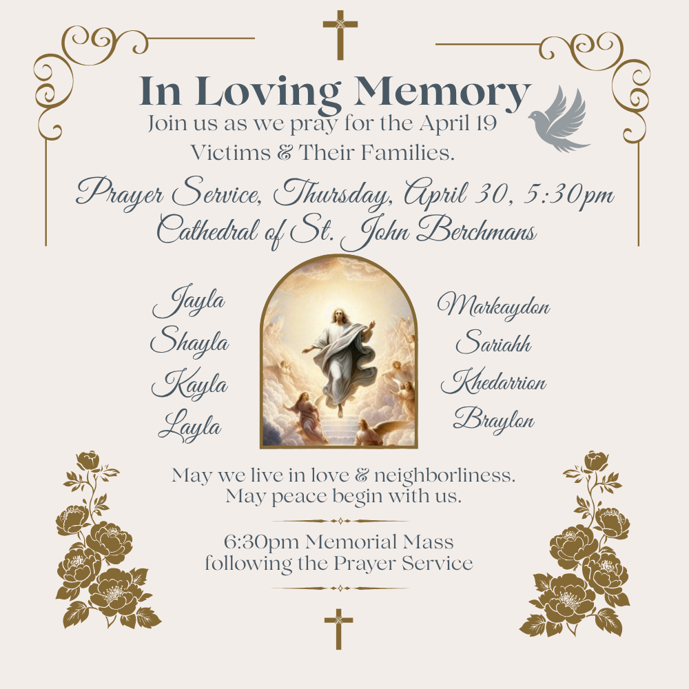 In light of the recent violence that has affected our community, I write to invite you to join us for an ecumenical prayer service and Mass as we come together in faith, solidarity, and hope. We will gather to pray for the victims, to commend them to the love and light of God, and to seek healing for all who suffer from the wounds this has caused.