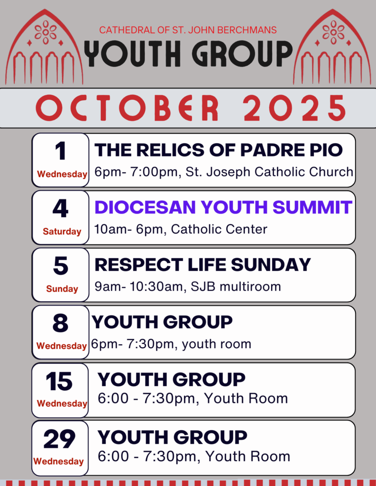 SJB High School Youth Group is a place where you can be yourself. It is where you get to grow in friendship with others while learning more about the Lord. We meet every Wednesday from 6:00 to 7:00 pm in the Parish Hall. It is a welcoming and loving place where you get to talk about God, eat free food, and of course, have lots of fun!